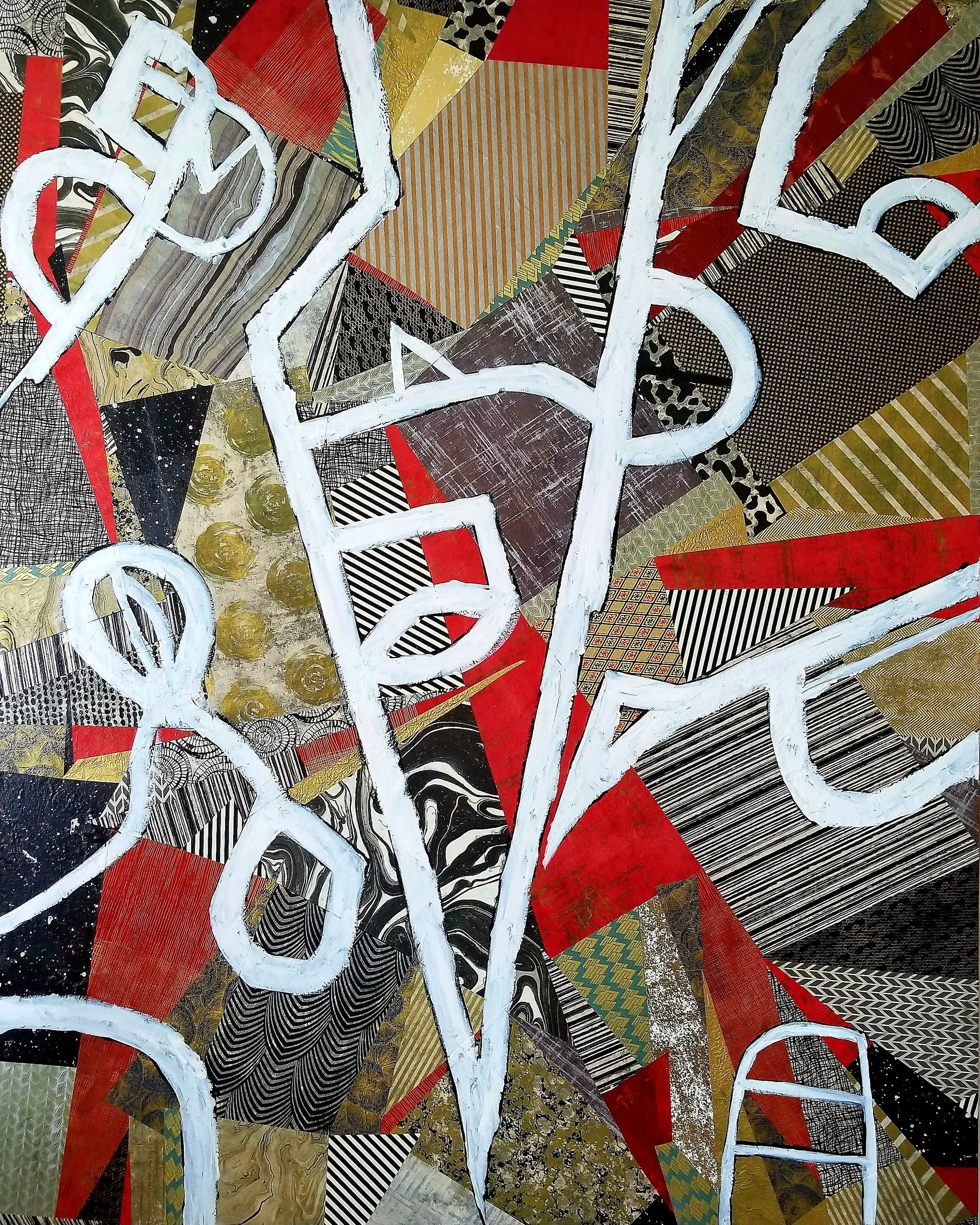 Papers, acrylic, gesso, mediums on canvas. 60”x48” 2020