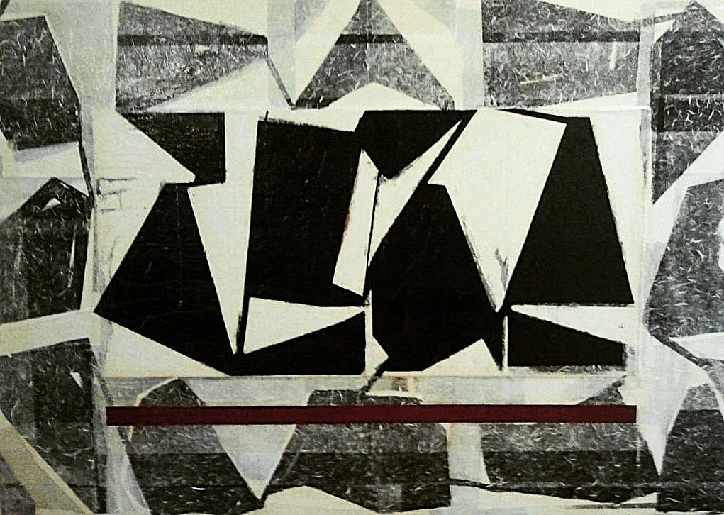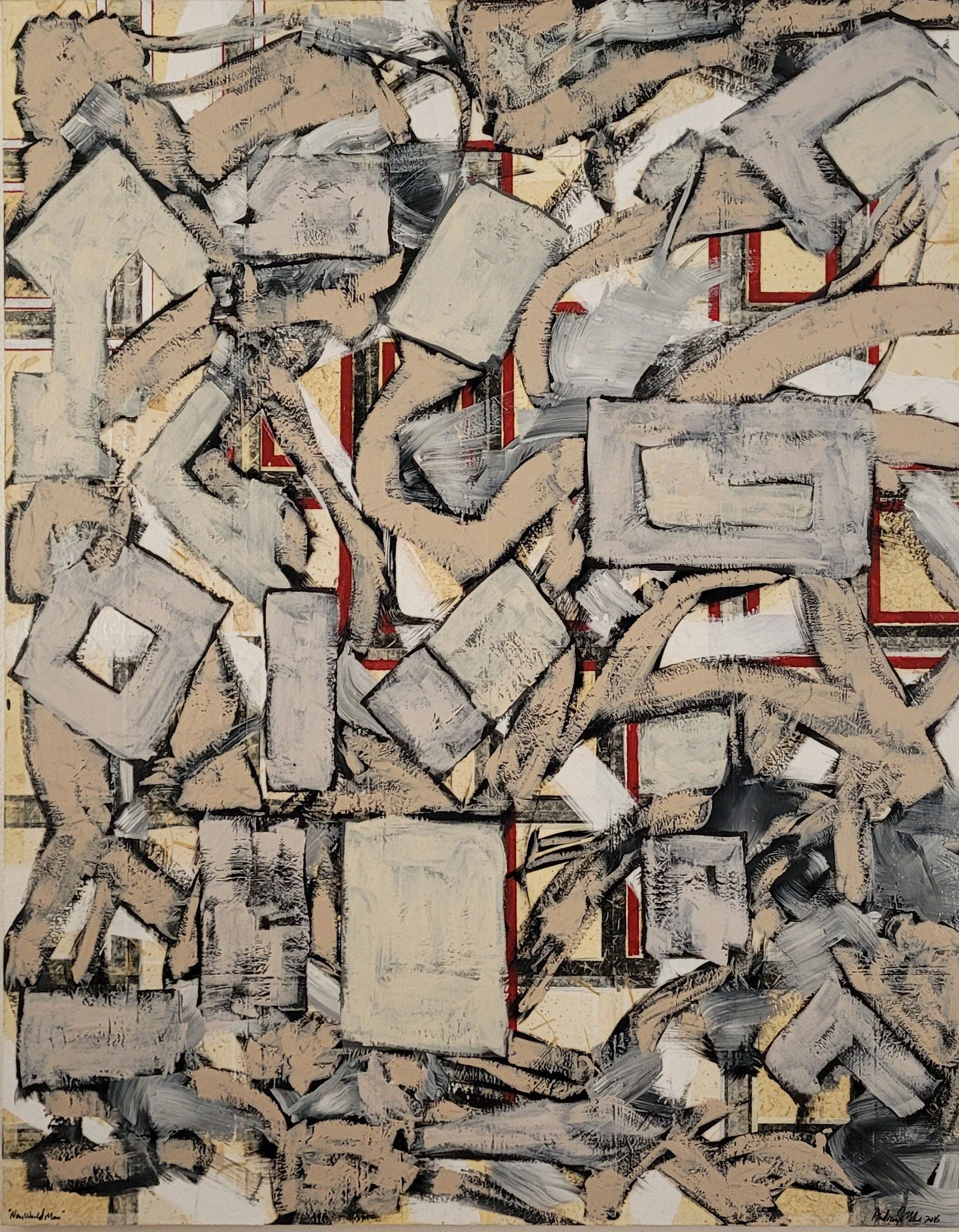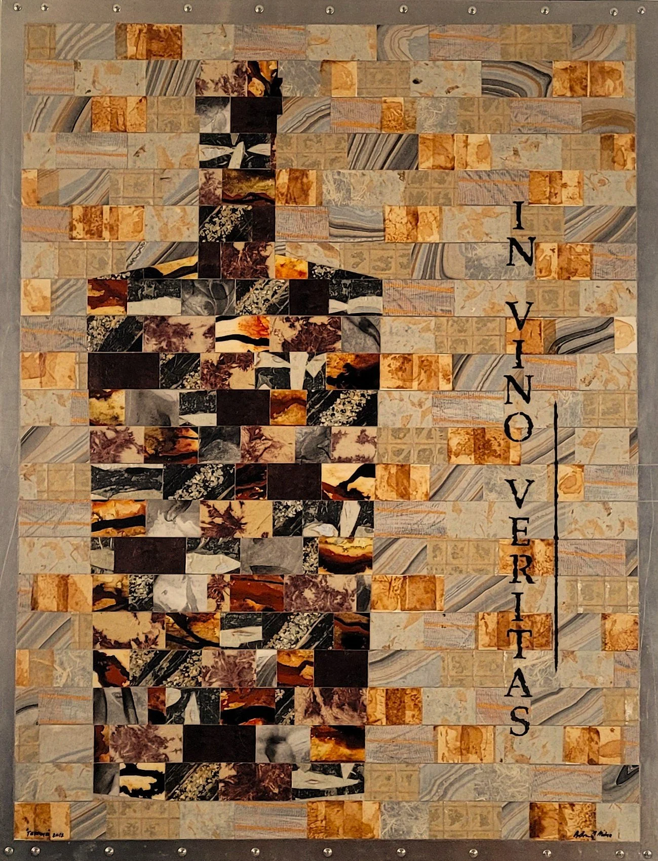 Handmade papers, acrylic, ink, paint chips, wine foils, cheesecloth, mulberry tissue on wood and stainless steel panel. 48”x37” 2017