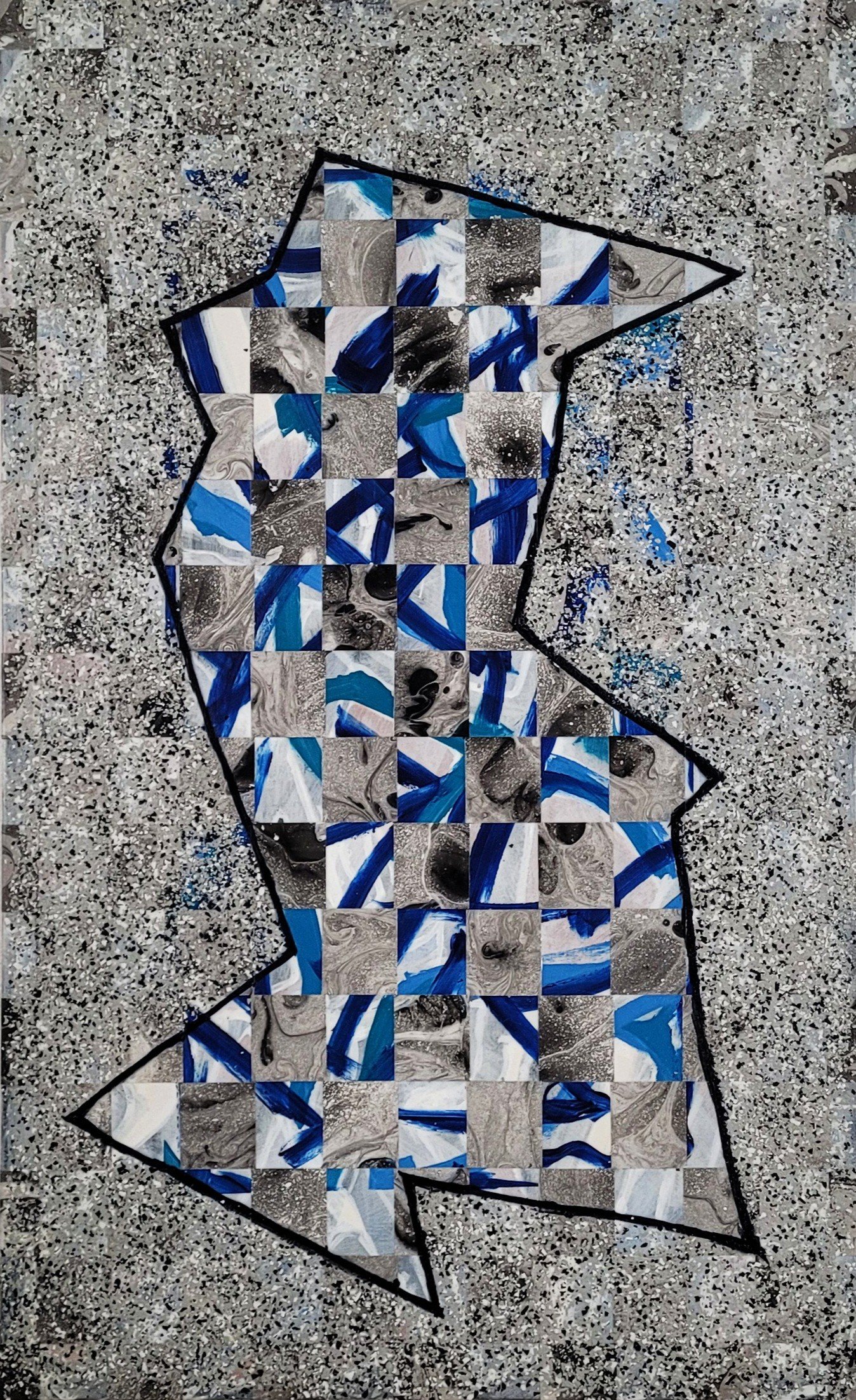 Ink water prints, acrylic, gesso, mediums, paint chips on canvas. 65”x40” 2025