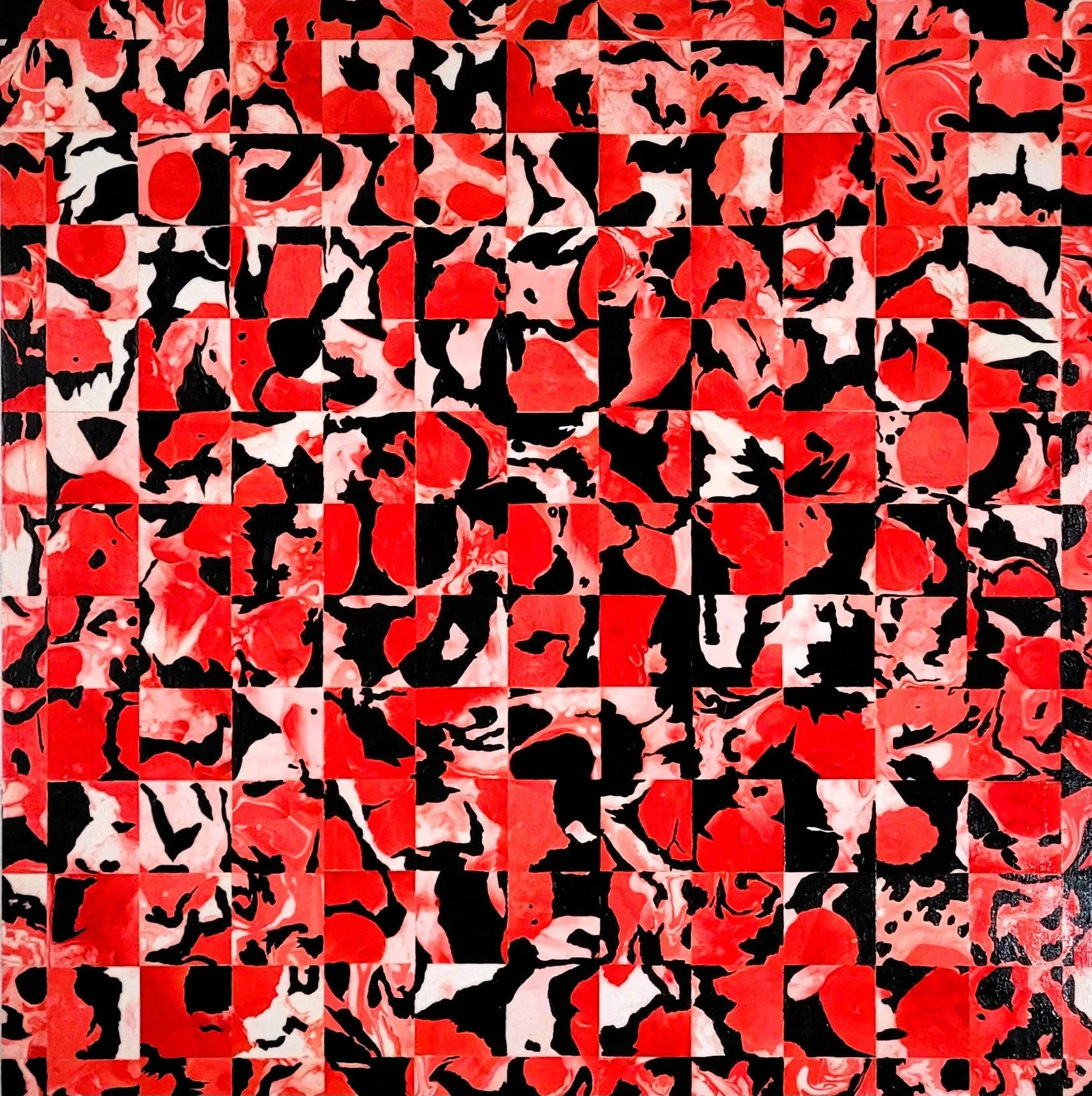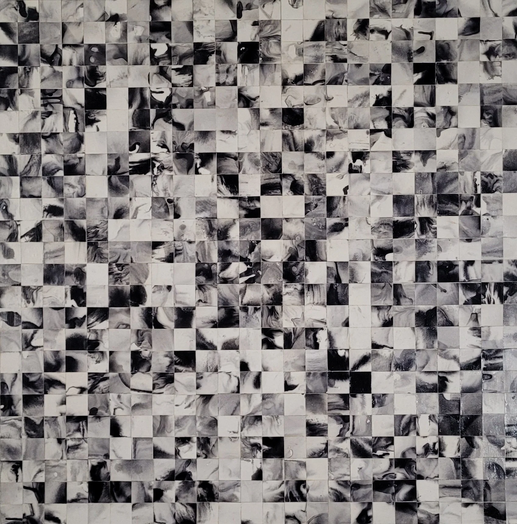 Collage of ink water prints, gesso, and mediums on hardboard. 48”x48” 2012
